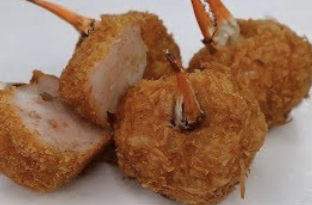 - Chia tôm ra, vo viên cỡ trứng vịt, xong bọc thịt cua vào giữa, rồi túm bọc càng cua lại, chừa đầu nhọn ló ra ngoài, xong lăn một lớp bột năn khô.