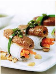 - Trải bánh hỏi ra, cho rau sống, cà rốt ngâm chua vào giữa, cuộn lại, đặt một miếng chạo bò lên trên, dùng hành lá đã chần mềm buộc lại và rưới vừng hành lên bánh hỏi. Dùng kèm nước mắm pha, lạc rang.