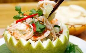 - Trộn bưởi, cà rốt, mực, tôm, thịt, ớt tỏi, chanh, nước mắm và đường cho vừa ăn, cho vừng và rau răm vào trộn đều.