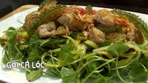 - Cá lóc lạng lấy thịt, bỏ da rửa sạch để ráo nước dùng, dao xắt theo chiều ngang. Cho 1/2 bát nước lạnh và 2/3 bát nước giấm vào nồi, đập giập 3 tép tỏi, vỏ chanh thái nhỏ, 1/2 lá rau cần tây, hành lá, 1/2 thìa đường. Đun thật sôi, đổ cá vào, trụng nhanh tay độ 5 phút cá chín, để ráo nước.