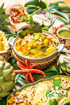 - Ếch làm sạch, ướp với hạt nêm, tiêu và ít dầu ăn, để khoảng 10 phút, mang rán vàng giòn, gỡ lấy thịt, bỏ xuống. Dưa chuột, ớt đỏ, hành tây thái sợi.