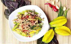 - Trộn hỗn hợp trên với khế, ngao, hành tây, kiệu chua, rau răm cho thấm đều. Dọn ra đĩa, rắc lạc rang lên. Món này dùng kèm bánh phồng tôm.