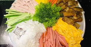 - Để miếng bánh phở lên mặt phẳng (đĩa, thớt) cho rau sống, dứa cắt sợi và thịt bò vào, cuốn tròn chặt tay. Món ăn này dùng với nước mắm chua ngọt nhưng ngon nhất là với tương bần.