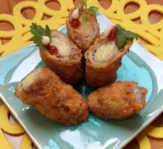 - Thịt thái lát mỏng. Ngô non trụng chín. Trứng gà đánh tan. Trải miếng thịt bò lên mặt phẳng, quết giò sống, đặt bắp ngô non lên rồi cuộn lại. Nhúng cuộn bò qua trứng, lăn qua bột xù, thả vào chảo dầu nóng rán vàng.