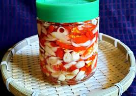 - Cho giấm, đường, nước và muối vào trong nồi nấu sôi khoảng 10 phút sau đó để nguội. Bóc bớt vỏ ngoài của tỏi, rồi rửa sạch và để ráo. Lấy hũ lớn có nắp kín, dùng nước sôi rửa sạch, để ráo. Sau đó, cho tỏi và đổ nước giấm đã nguội vào. Đậy kín nắp và cất nơi mát khoảng một tuần cho tỏi thấm. Khi ăn nên lột lớp vỏ còn sót lại. Hũ tỏi có thể giữ được cả năm.